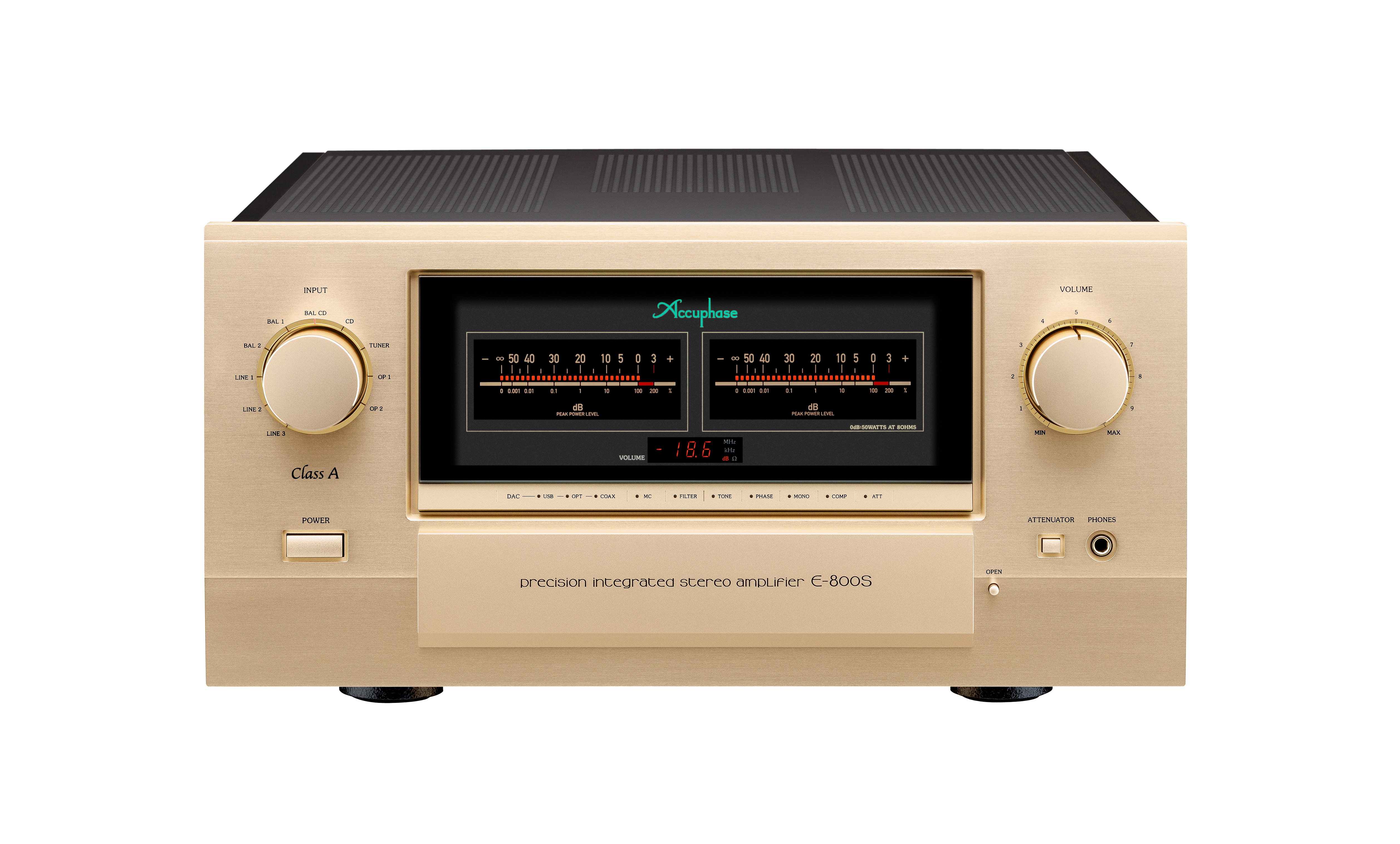 E-800S on Accuphasen lippulaivamalli, joka sisältää koko Accuphase:n integroituja vahvistimia koskevan laajan osaamisen. Esivahvistinosassa on käytetty balansoitua AAVA-tyyppistä äänenvoimakkuuden säätöä, kun taas päävahvistinosassa hyödynnetään instrumentointivahvistimen periaatetta ja kuusinkertaista rinnakkaista push-pull-rakennetta, jossa käytetään Class A -luokassa ajettuja MOS-FETtejä. Nauti E-800S:n huippulaadukkaasta toistosta.